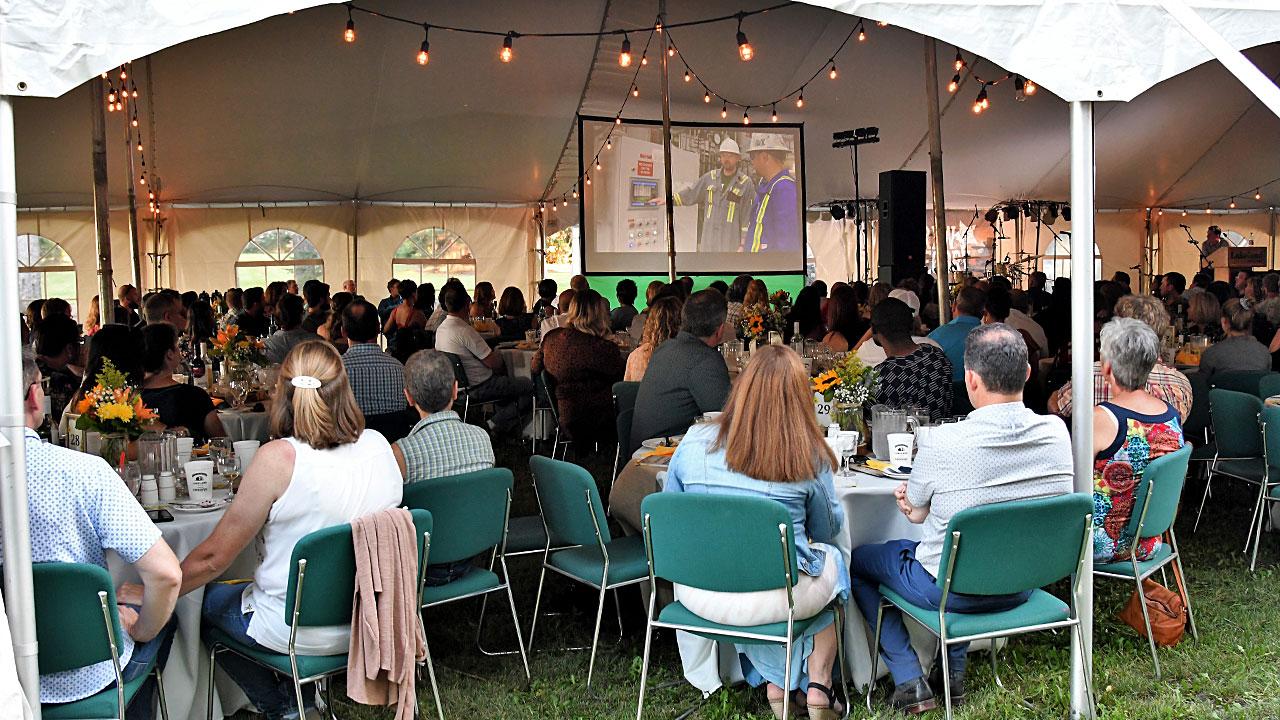 Guests enjoying the video featuring projects supported by Feast on the Farm. (2022)